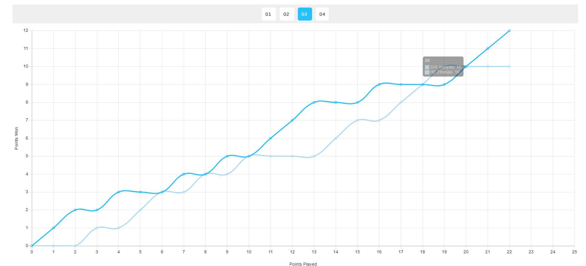 第三局是何卓佳最後一波的一局,石洵瑤開局打得很順一度8-5領先,但何卓佳追到8-8、10-10,最終石洵瑤拿到關鍵分取得勝利,大比分3-0領先後何卓佳反撲的氣焰完全被澆滅了。