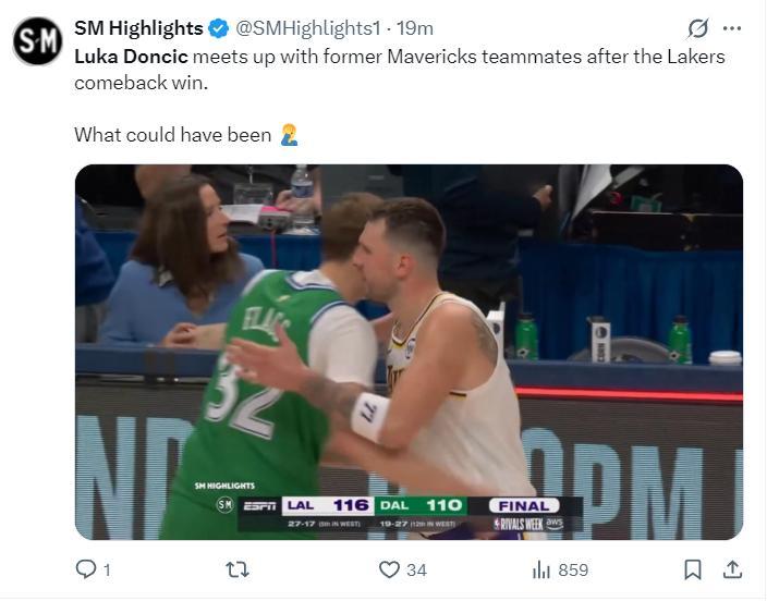 在比賽結束後,東契奇跟獨行俠的多位球員都進行了擁抱,他也跟獨行俠小老闆馬克-庫班擁抱致意。