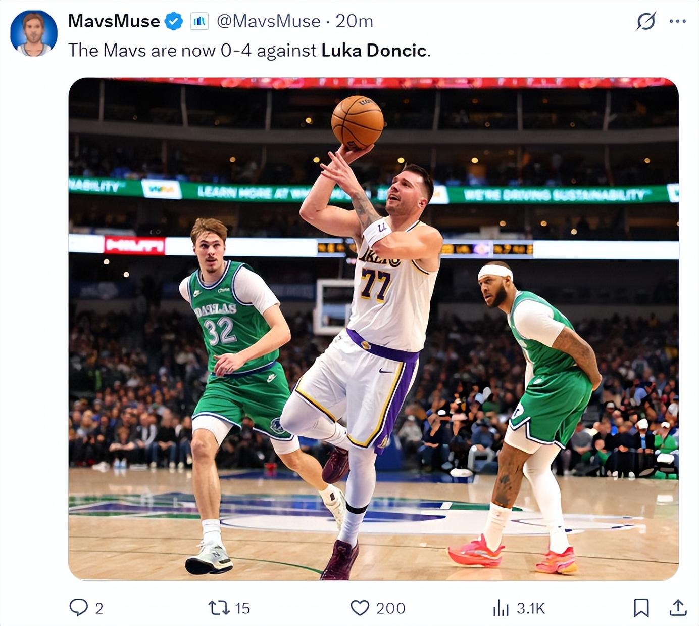 在東契奇被交易到湖人後他面對母隊獨行俠是4勝0負延續不敗,他也在這片場地上成爲NBA歷史上最年輕命中1500記三分球的球員。
