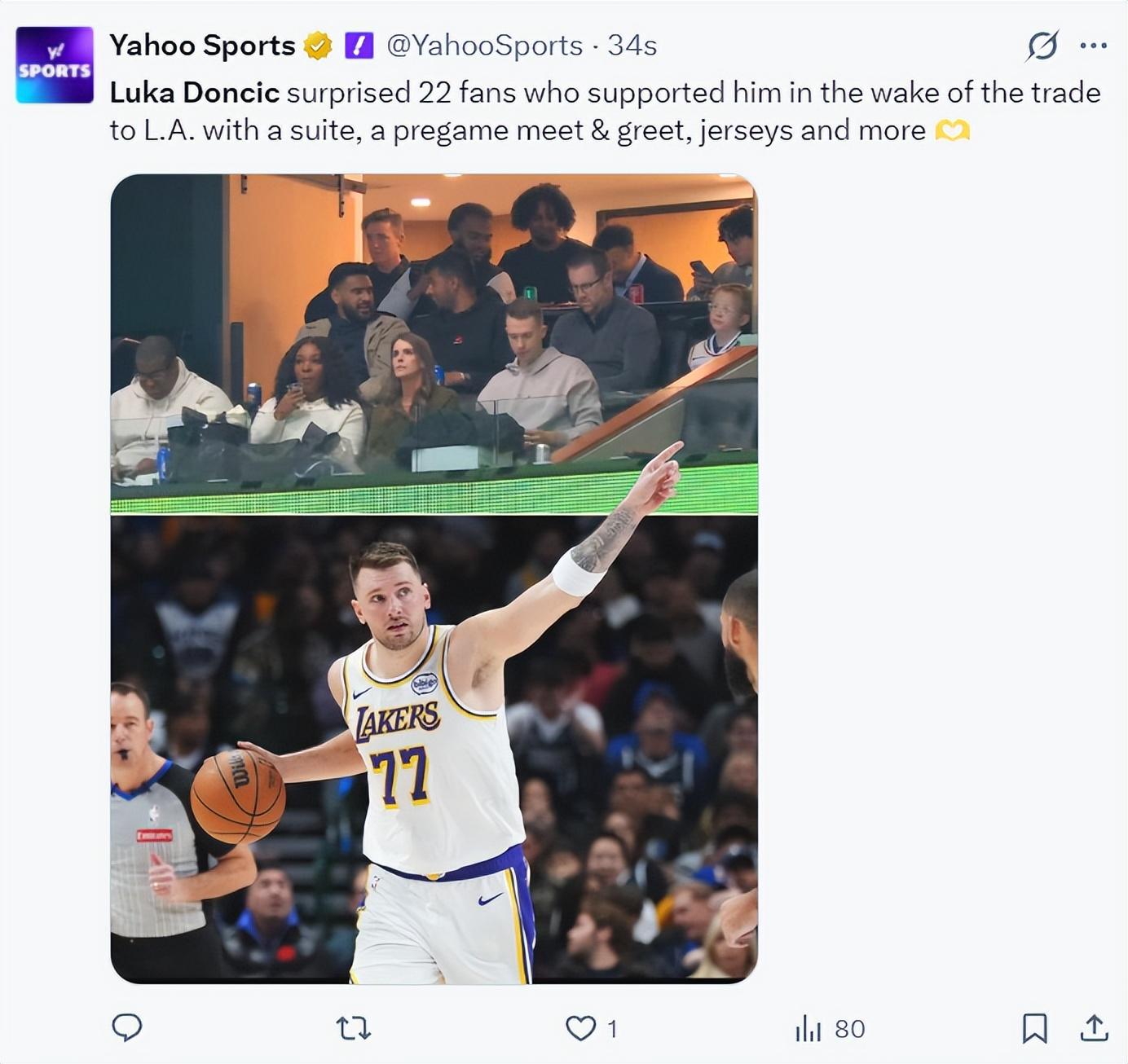 根據《雅虎體育》的報道,在東契奇被交易到湖人後,他還是爲22位死忠粉送出了豪華包廂、賽前見面會、簽名球衣等,這些球迷都非常的開心。