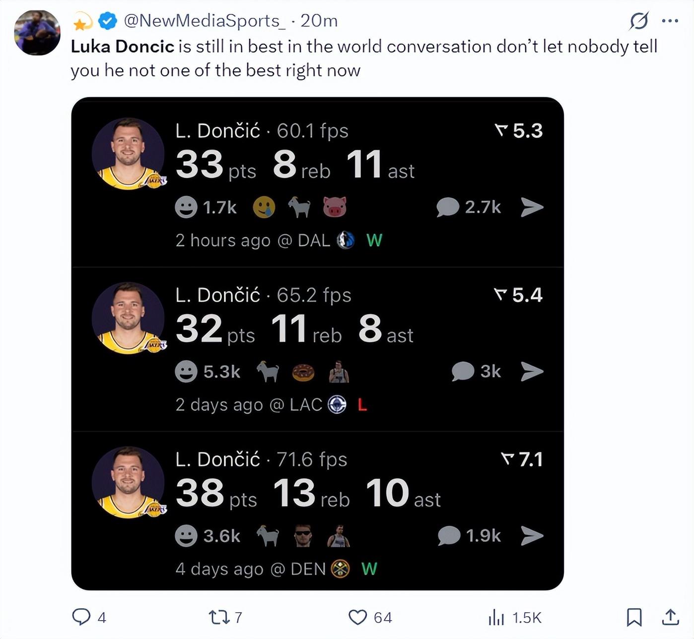 湖媒曬出東契奇過去的三場比賽均拿到30+10+8的數據其中還有一場三雙,他寫道:東契奇一直以來都是世界上最頂尖的球員,那些說他不是頂尖球員的人根本不懂球。