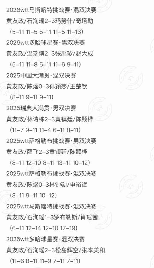 黃友政在男雙、混雙項目上已經換過非常多的搭檔:石洵瑤、陳熠、薛飛、林詩棟、溫瑞博等等,可從2025賽季至今他搭檔的所有雙打項目決賽是一波8連敗(沒有進入決賽的場次更是數不勝數),其中7次是輸給外協,所有黃友政這個‘雙打接班人’的綽號是貶義詞,但他搭檔林詩棟奪冠後終於掃去了陰霾。
