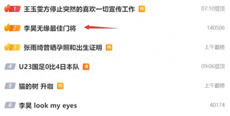 李昊無緣最佳門將登上了國內熱搜榜第二的位置,很多的球迷認爲這個最佳門將不該給日本門將,因爲李昊在進入決賽之前累計492分鐘不失球創造U23亞洲盃歷史首人紀錄,決賽丟4球有3個不該怪李昊。