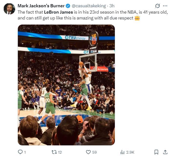 美媒寫道:勒布朗已經41歲在這個聯盟征戰23載,他還能這樣飛起來真的令人驚歎不已,我真的要向他致敬(皇冠)。