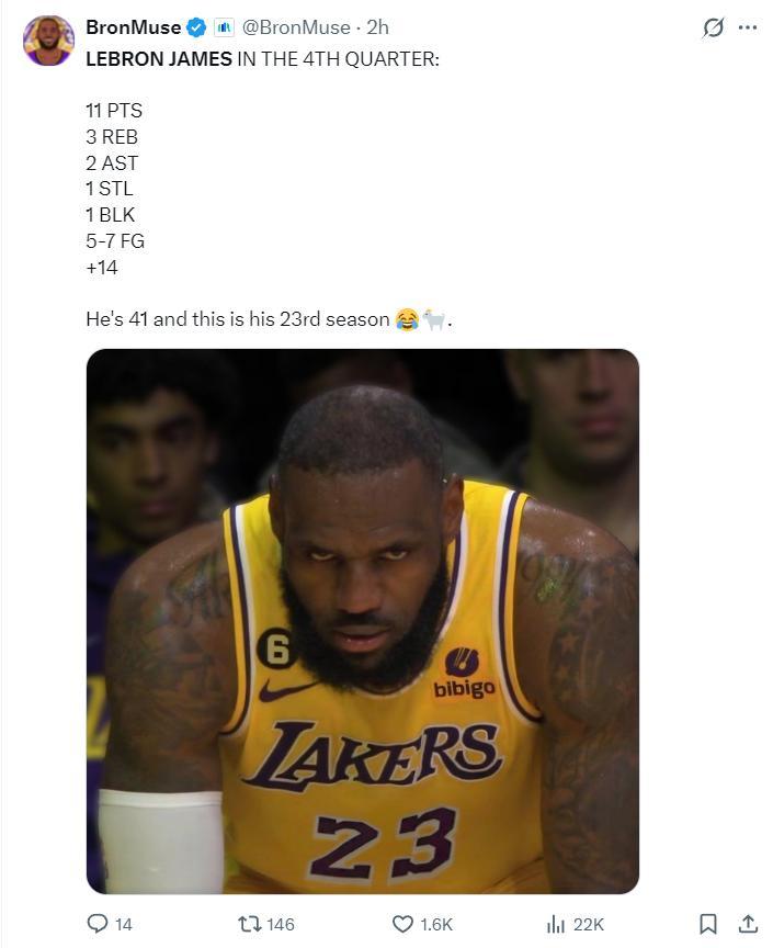 末節勒布朗打滿了12分鐘,7中5,三分1中1,在沒有罰球的情況下拿到11分3籃板2助攻1搶斷1蓋帽,正負值+14,這裏面還有一個切球沒有算在數據內,湖媒盛讚41歲征戰第23個賽季的老頭子爲GOAT。