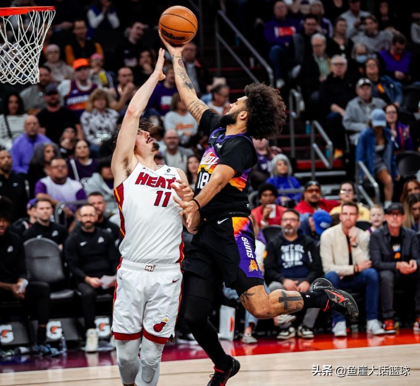 第一節比賽阿德巴約命中三分,阿倫罰球得分後狄龍中投命中,阿倫突破得分後拉松罰球得分,鮑威爾拋投得分後阿倫拋投也得分,本來之後兩隊打得很膠着,但後續太陽進攻狀態糟糕,維金斯、鮑威爾幫助熱火取得領先不說,後面約維奇等人也幫助熱火拉開比分,第一節比賽結束熱火領先11分。第二節比賽阿倫、狄龍幫助太陽追分,本來之後阿德巴約、維金斯幫助熱火穩住局勢,但後續太陽一波6-0追平比分,接下來兩隊打得混亂比分很膠着,末尾階段太陽進攻停滯,反觀熱火這邊約維奇命中三分,維金斯也完成補籃,加上鮑威爾內突外投持續得分,半場比賽結束熱火領先10分。