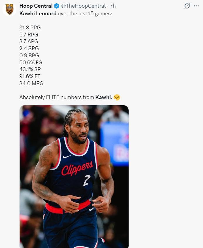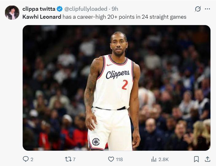 自12月20日以來小卡出戰了15場比賽(缺席了三場),他場均達到32.1分聯盟第一,這期間快船18場比賽贏下了其中的15場比賽,快船期間的戰績也是聯盟第一。