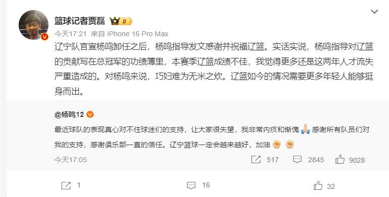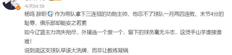 熟悉的個人身體原因,楊鳴指導辭職也登上了熱搜,因爲大家都知道遼寧男籃剛剛經歷了一波四連敗,楊鳴指導很可能是球隊的替罪羊。