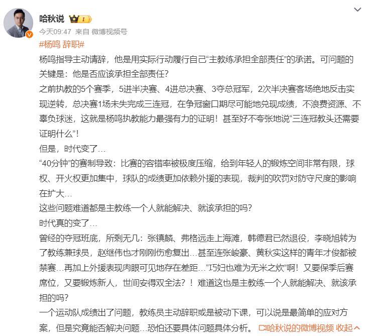楊鳴指導還在個人社媒上致歉:最近球隊的表現真心對不住球迷的支持,讓大家很失望,我非常內疚和慚愧。