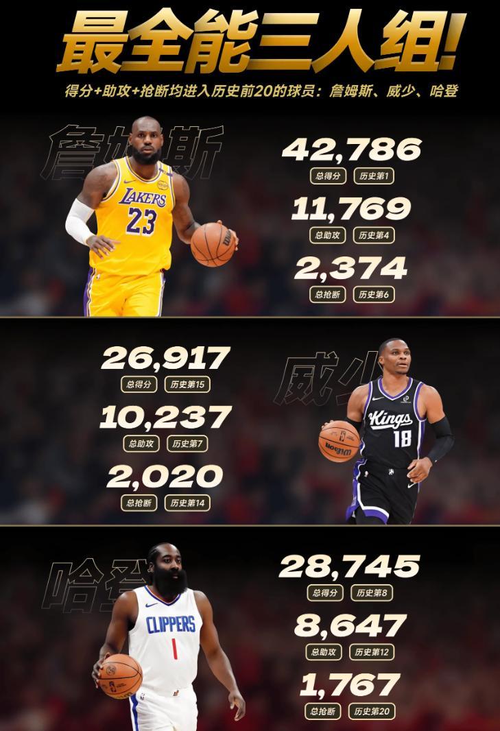 現役也只有三人得分、助攻、搶斷進入前20,這三人分別是:詹姆斯、威少、哈登。