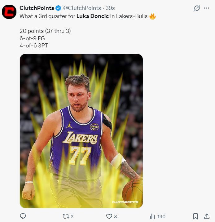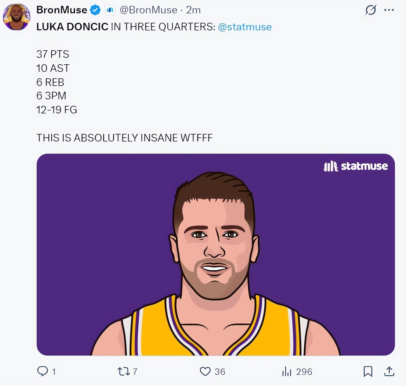 第三節湖三崩雖遲但到,湖人上半場一度領先到20分,第三節直接被縮小到3分,全隊全靠東契奇一人去拿分,東契奇連續三個三分球爲湖人續命,東契奇9分鐘裏連拿16分幫助湖人再度領先到9分,單節東契奇9中6+三分6中4拿到20分3籃板2助攻,三節37分10助攻大號兩雙。