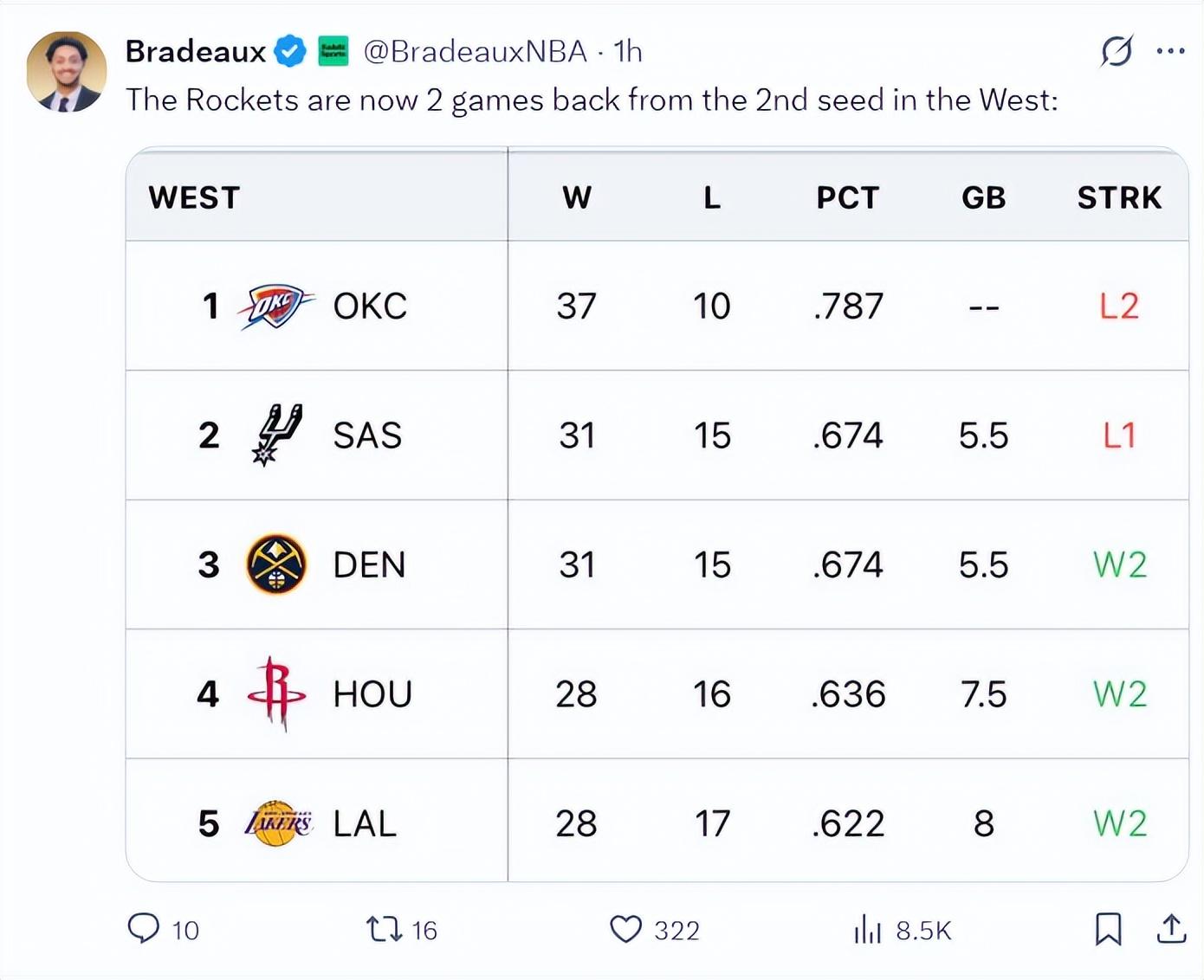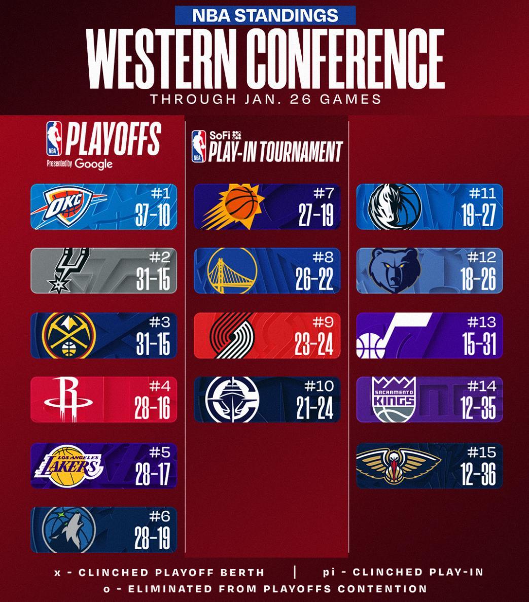 這個比賽日後,西部排名:雷霆、馬刺、掘金、火箭、湖人、森林狼、太陽、勇士、開拓者、快船、獨行俠、灰熊、爵士、國王、鵜鶘。