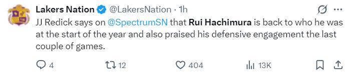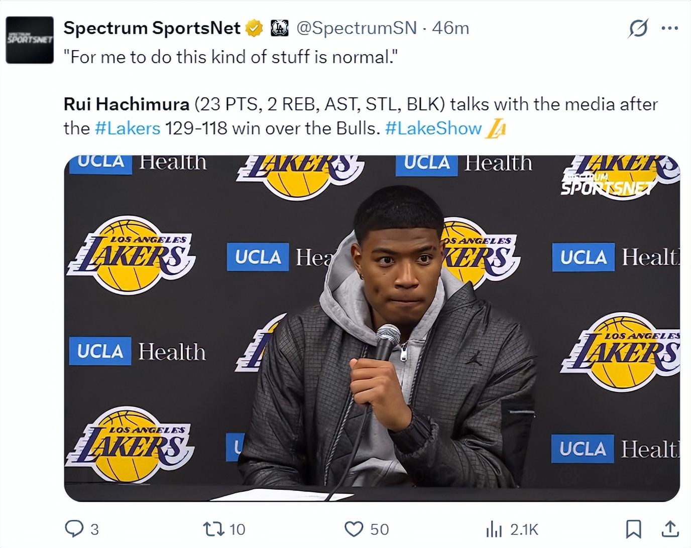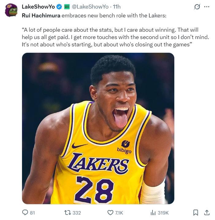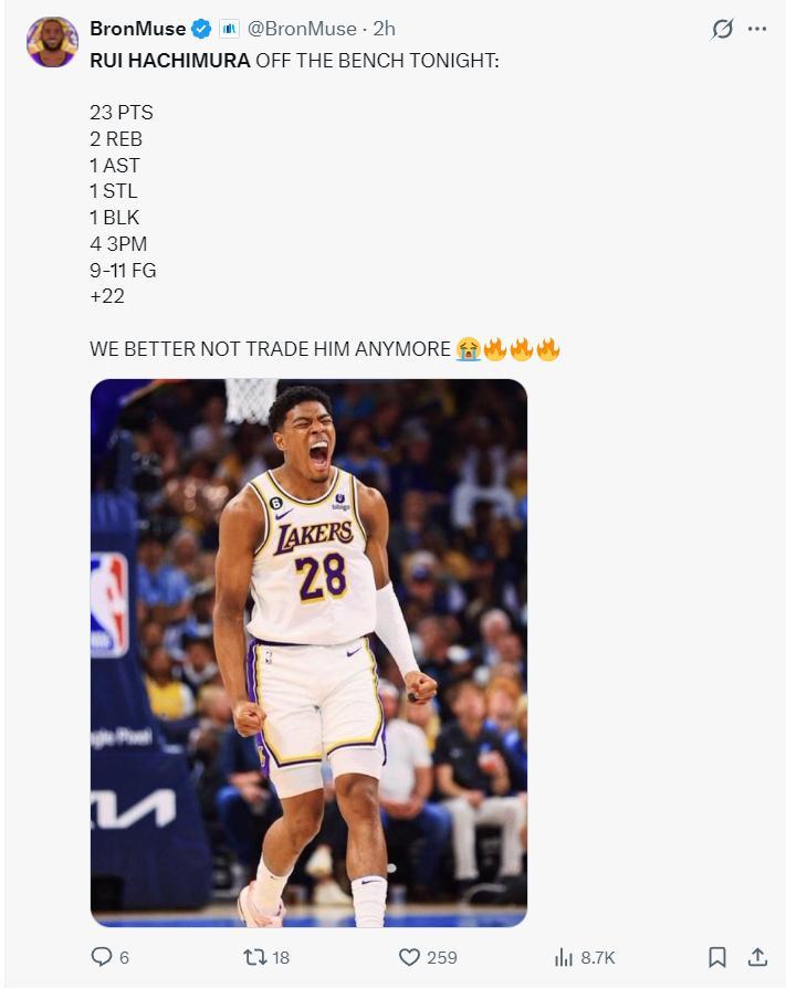 八村壘賽後接受採訪,他盛讚了這個團隊能看出他很不願意離開LAL,他說道:我 要表揚我的教練,教練在會議上跟他們談過了,讓勒布朗、盧卡要多給隊友球,他們也確實這樣做了,他們總是接受教練的建議,所以我們能贏球,每個人都可以觸球,每個人都能積極參與進攻,這纔是籃球該有的樣子。