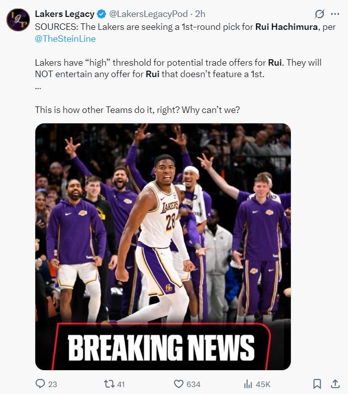 根據NBA記者馬克-斯坦恩的報道,湖人隊正在評估八村的交易價值,他們的要價至少是一個首輪籤。湖人對涉及八村的交易有着很高的要求,他們絕對不會接受沒有首輪籤的任何交易提議。
