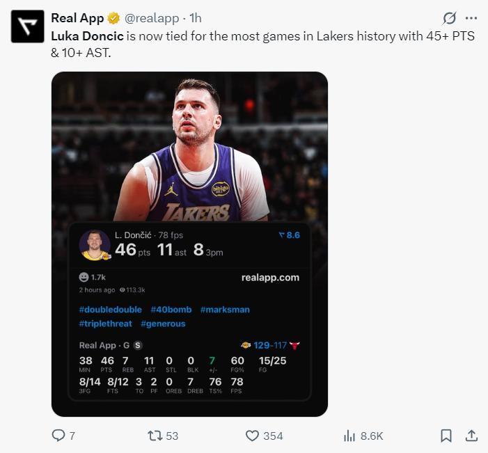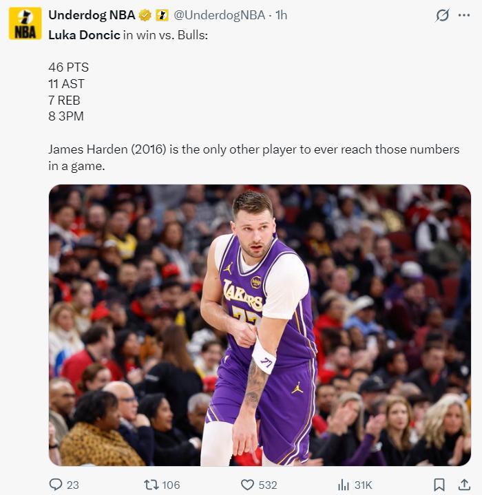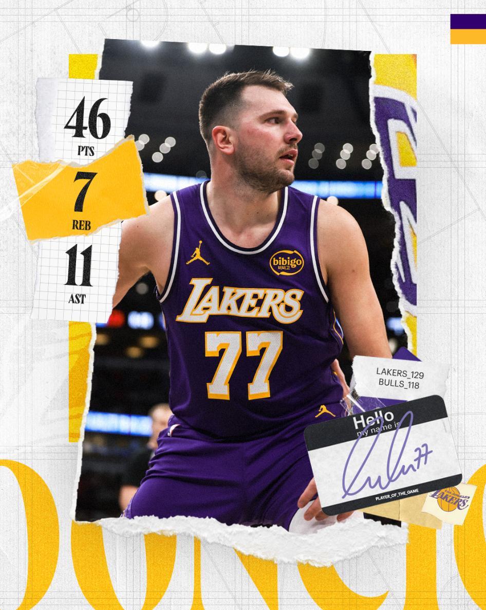 這場比賽東契奇一戰創造多項紀錄:1.他比肩詹皇成爲湖人隊史單場45+10助攻最多的球員;