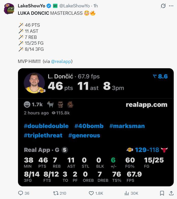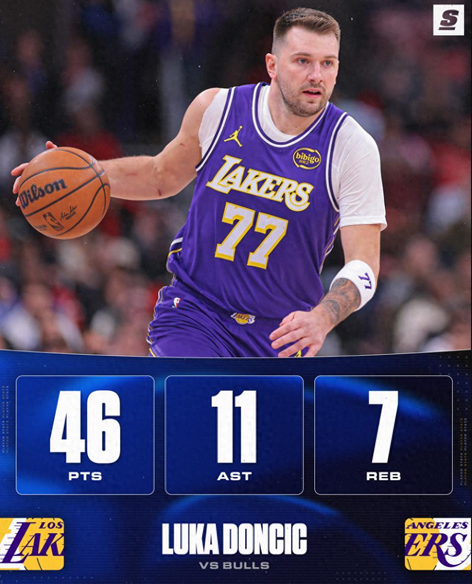 盧卡-東契奇在對陣公牛的比賽中,第三節單節狂轟20分,全場比賽38分鐘,25中15,三分14中8,拿到46分11助攻7籃板,命中率60%,三分命中率57.1%,真實命中率76%,正負值+6。