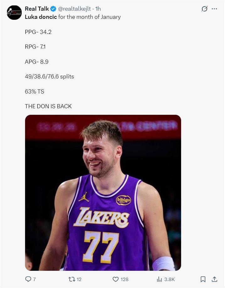 整個一月份東契奇場均34.2分8.9助攻7.1籃板,命中率49%,三分命中率38.6%,真實命中率63%。