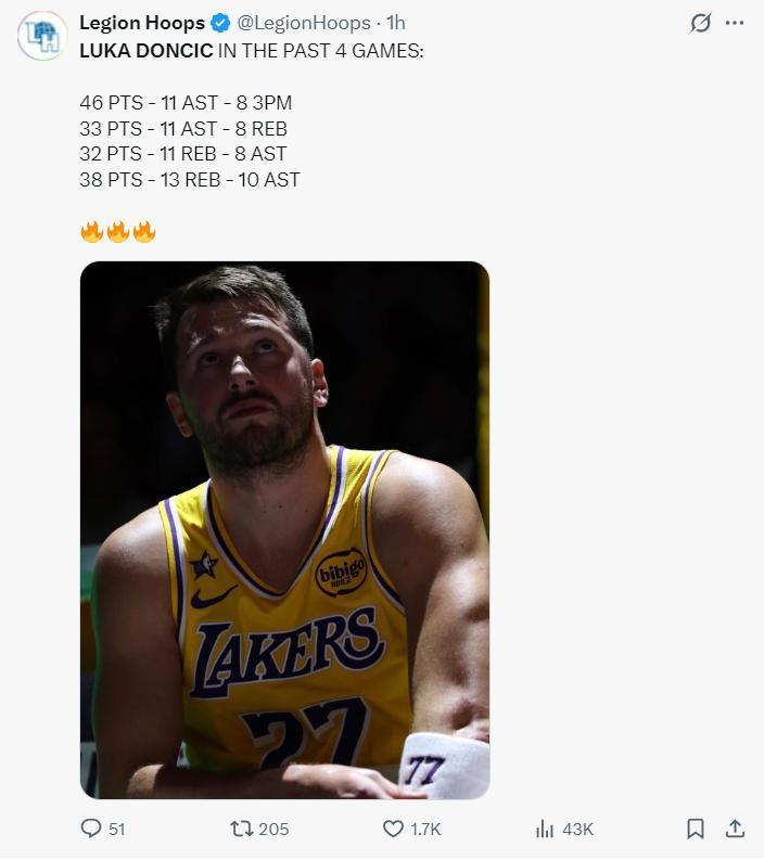 最近的四場比賽東契奇場均37.3分10助攻9.8籃板,命中率52.3%,三分命中率38.6%。