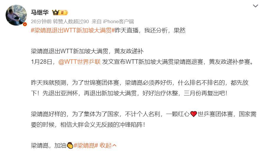 馬繼華寫道:我昨天就預測過,爲了世乒賽團體賽梁靖崑必須養好傷,什麼世界排名都不重要,先退亞洲盃再退新加坡大滿貫,好好治療休整,三月份再復出吧。