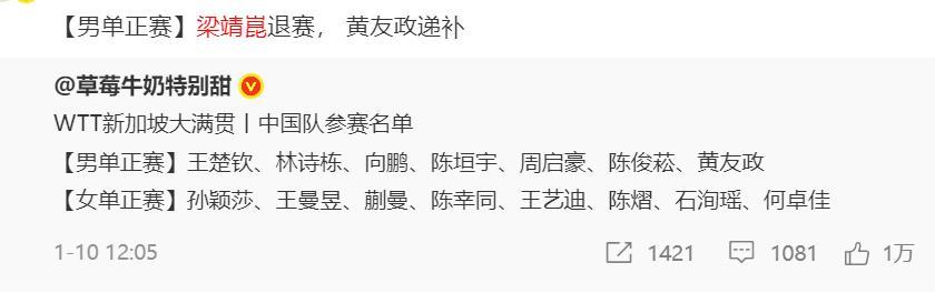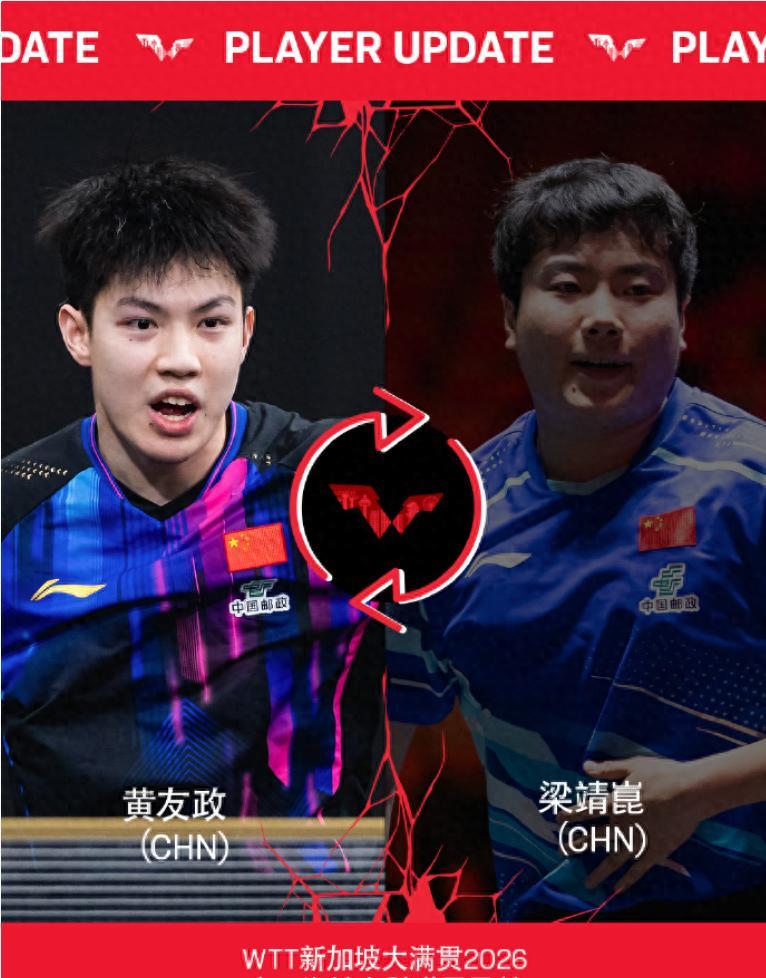 北京時間1月28日,WTT官方宣佈,中國球員梁靖崑退出新加坡大滿貫賽事,另一中國球員黃友政遞補進入。(新加坡大滿貫將於2月19日-3月1日舉行)