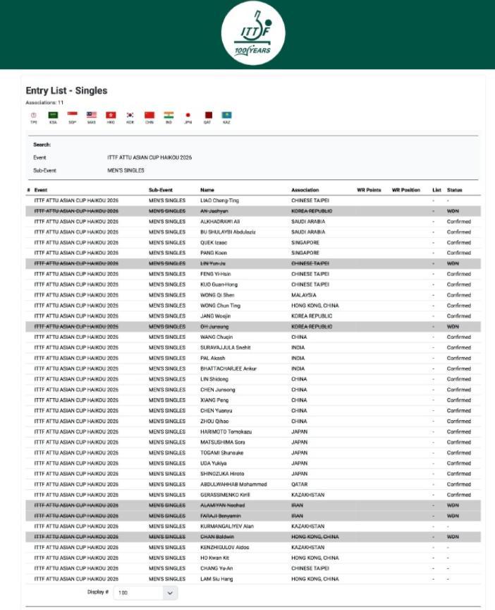 兩天之前,根據ITTF官方中國隊參與亞洲盃的名單來看,29歲的梁靖崑也已經退出,20歲的小將陳俊菘則已經進入亞洲盃名單。(2月4日-6日)
