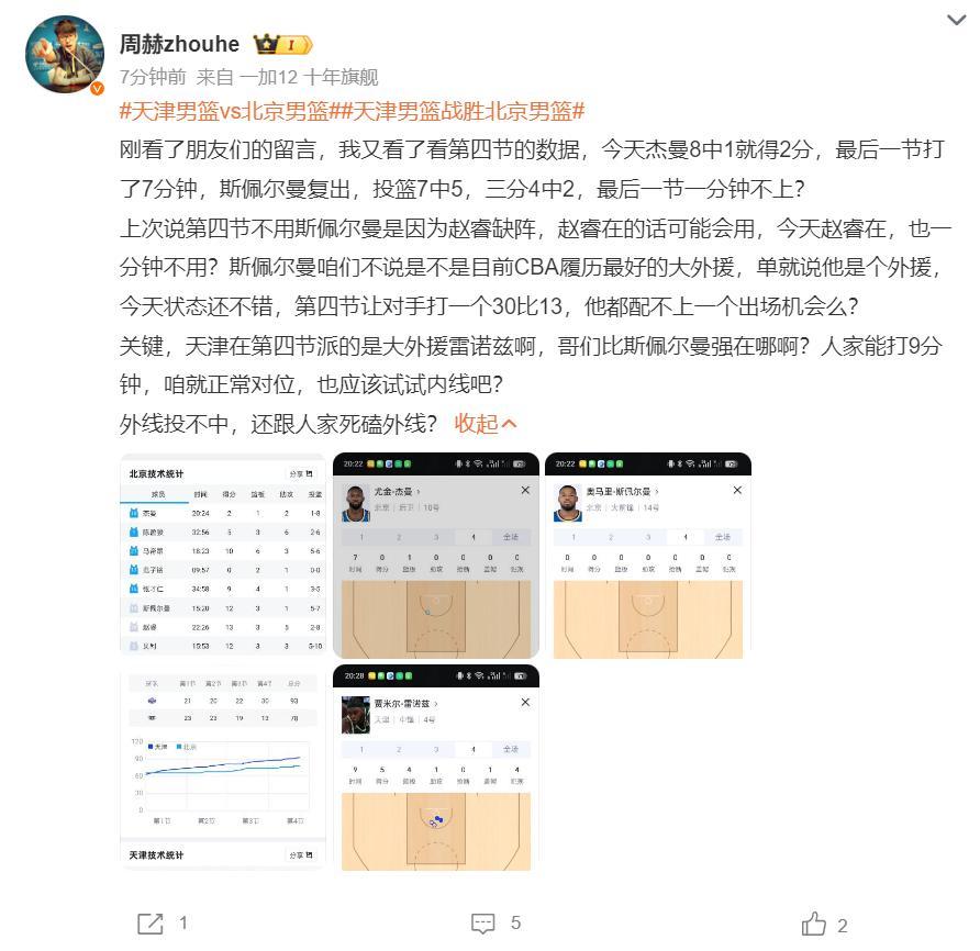 媒體人周赫對北京這場失利非常不滿,他認爲末節該棄用的是8中1的傑曼而非斯佩爾曼,因爲末節天津是用雷諾茲,北京這邊應該讓斯佩爾曼上去限制他的發揮。