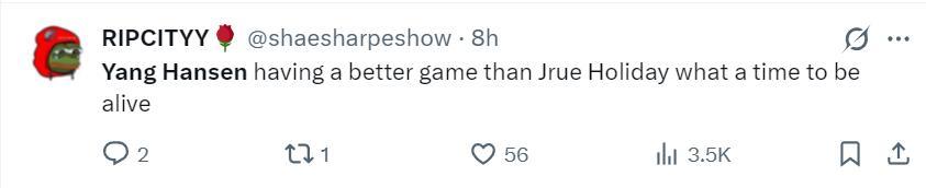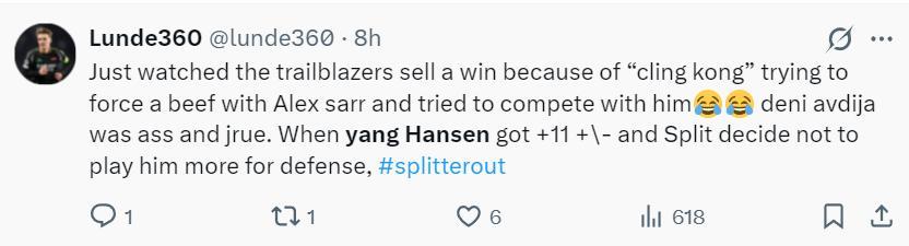 賽後開拓者球迷、開拓者媒體、美國媒體都爲楊瀚森此役的表現點贊:克林根與薩爾發生了一次衝突導致球隊的勝利溜走,而楊瀚森在場+11明顯更出色,可斯普利特卻不讓他在關鍵時刻參與防守。