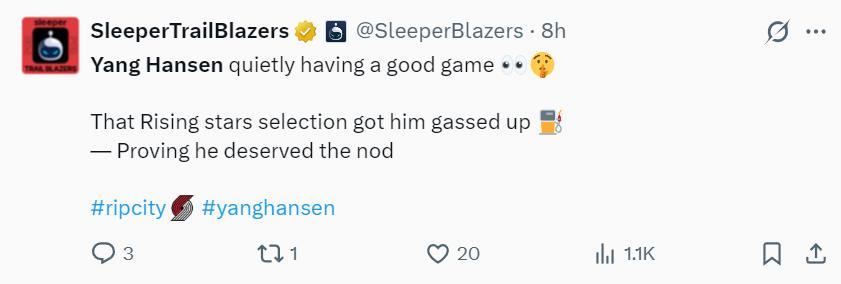 開拓者球迷:楊瀚森真的表現很好,他終於看起來像一個NBA球員了,繼續保持下去吧。