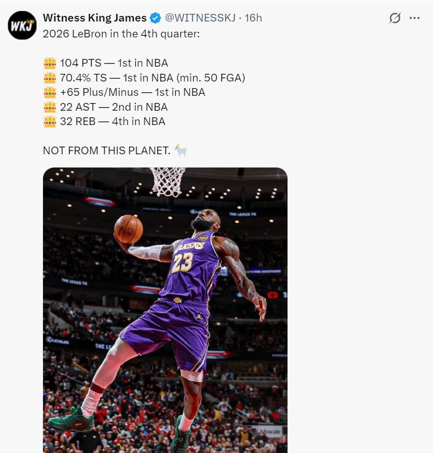 在湖人拒絕公牛逆轉的賽後,美媒曬出進入2026年後,勒布朗末節104分聯盟第一,杜蘭特末節102分聯盟第二,勒布朗41歲高齡,杜蘭特37歲高齡,時光一晃眼過去了10多年,可詹杜雙皇依舊炸裂。