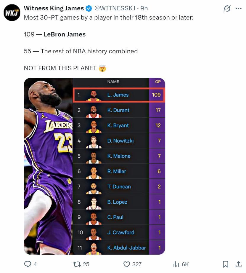 在這個聯盟征戰至少18個賽季的球員中,勒布朗已經拿到109次30+斷崖第一,杜蘭特才17次,科比只有12次,勒布朗就是歷史最長的河。
