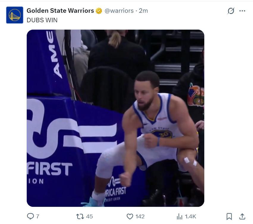 庫裏再一次又在客場跳舞了,這場比賽勇士8人上雙而且全隊命中23個三分球非常恐怖,庫裏的開心溢於言表。
