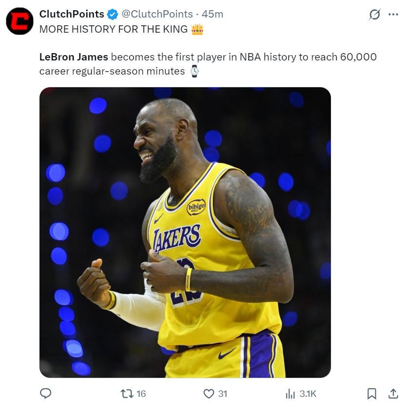 這場比賽勒布朗-詹姆斯還完成了常規賽6萬分鐘的里程碑,他再度刷新了一項歷史首人紀錄。不過,此役勒布朗的發揮很差,27分鐘,10中3,三分3中0,罰球6中5,拿到11分5助攻3籃板1搶斷6失誤,命中率30%,正負值-23。(勒布朗的二重扎心)