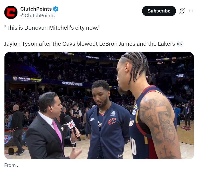 泰森沒有讓米球回答,他搶答:這裏現在是米切爾的城市,騎士隊是米切爾的球隊,當勒布朗回到這裏,我們會像給勒布朗加油一樣爲米切爾吶喊,這是屬於米切爾的時刻,這裏是他的城市。