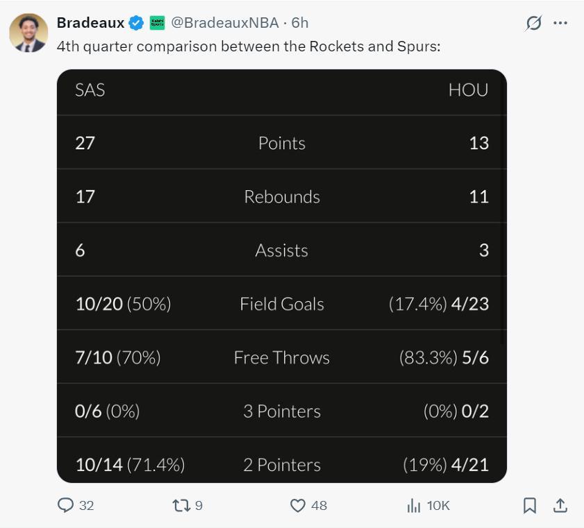 火箭記者Bradeaux曬出末節火箭與馬刺的數據對比,馬刺27分-火箭13分,籃板馬刺也贏下6個,助攻馬刺贏下6個,馬刺命中率50%,火箭命中率17.4%,火箭末節23中4是本賽季最差的一節。