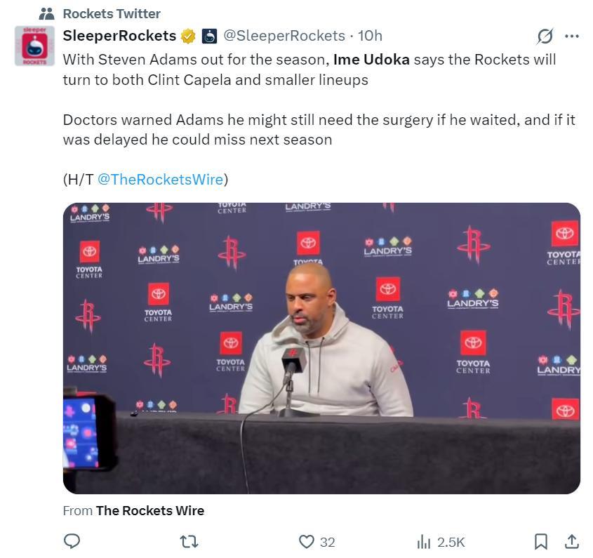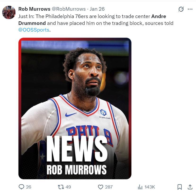 賽後根據美記Rob Murrows的報道,聯盟有消息人士透露,因爲亞當斯左腳踝手術賽季報銷,火箭隊已經開始探索交易安德烈-德拉蒙德,休斯頓對莊神非常感興趣。
