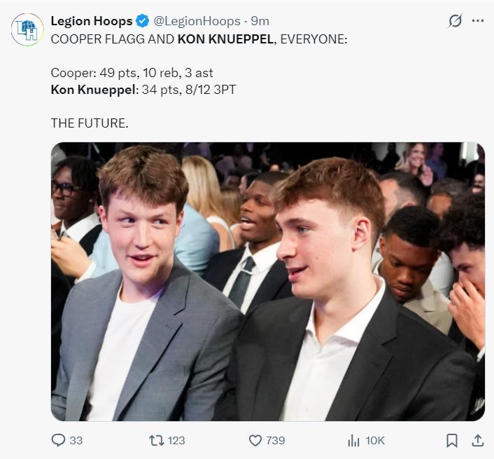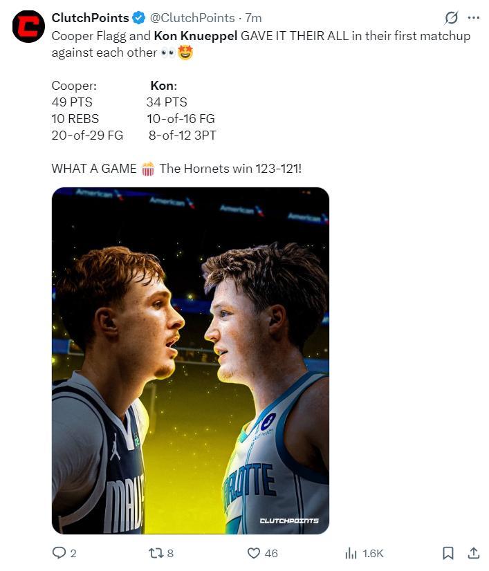 NBA記者凱文-奧康納寫道:弗拉格49分,克努佩爾34分並利用罰球準絕殺,這是他們離開杜克大學後首次對決,對於這兩位新秀來說這是多麼特別的一個夜晚啊。