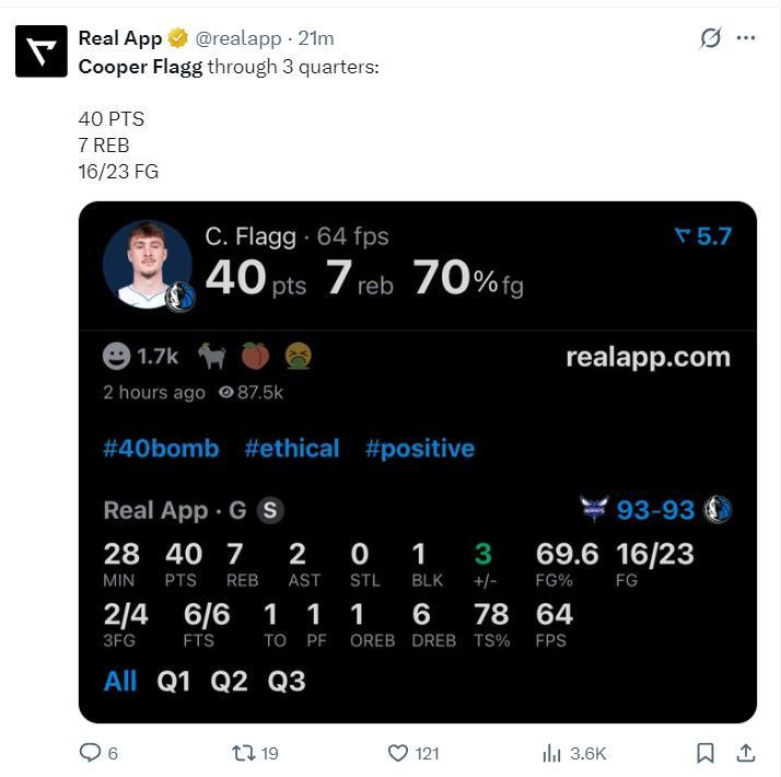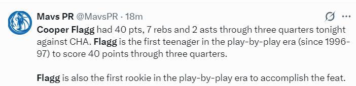 北京時間1月30日,獨行俠基石庫珀-弗拉格迎來了職業生涯之夜,他的得分刷新NBA生涯新高,全場比賽拿到49+10+3,這場比賽他一戰創造多項紀錄,尤其是第二節單節23分打出了前獨行俠基石東契奇的風采,只可惜最終出現致命失誤葬送比賽,獨行俠121-123惜敗黃蜂。