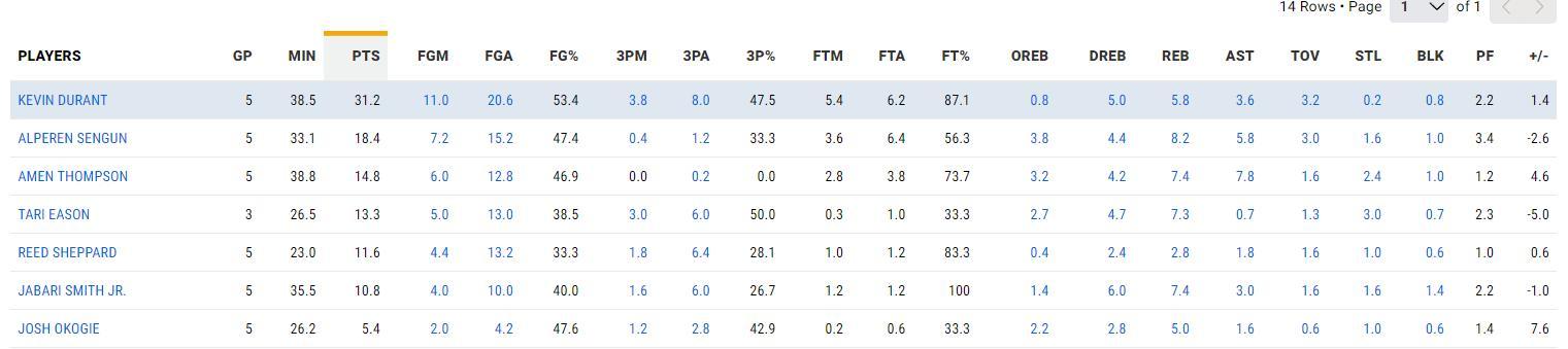 這場比賽杜蘭特只打34分鐘是過去五場比賽最少的一場,近五場比賽杜蘭特4次30+,場均38.5分鐘,拿到31.2分5.8籃板3.6助攻0.2搶斷0.8蓋帽,命中率53.4%,三分命中率47.5%,罰球命中率87.1%,正負值+1.4。