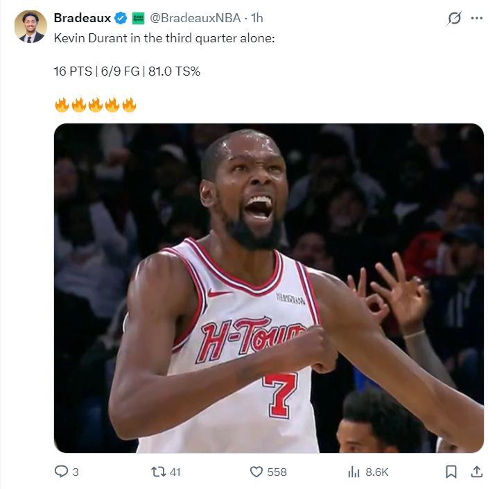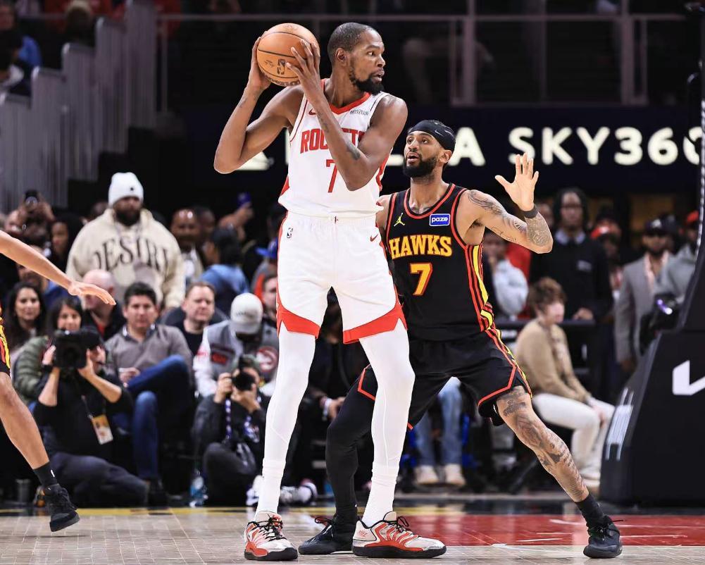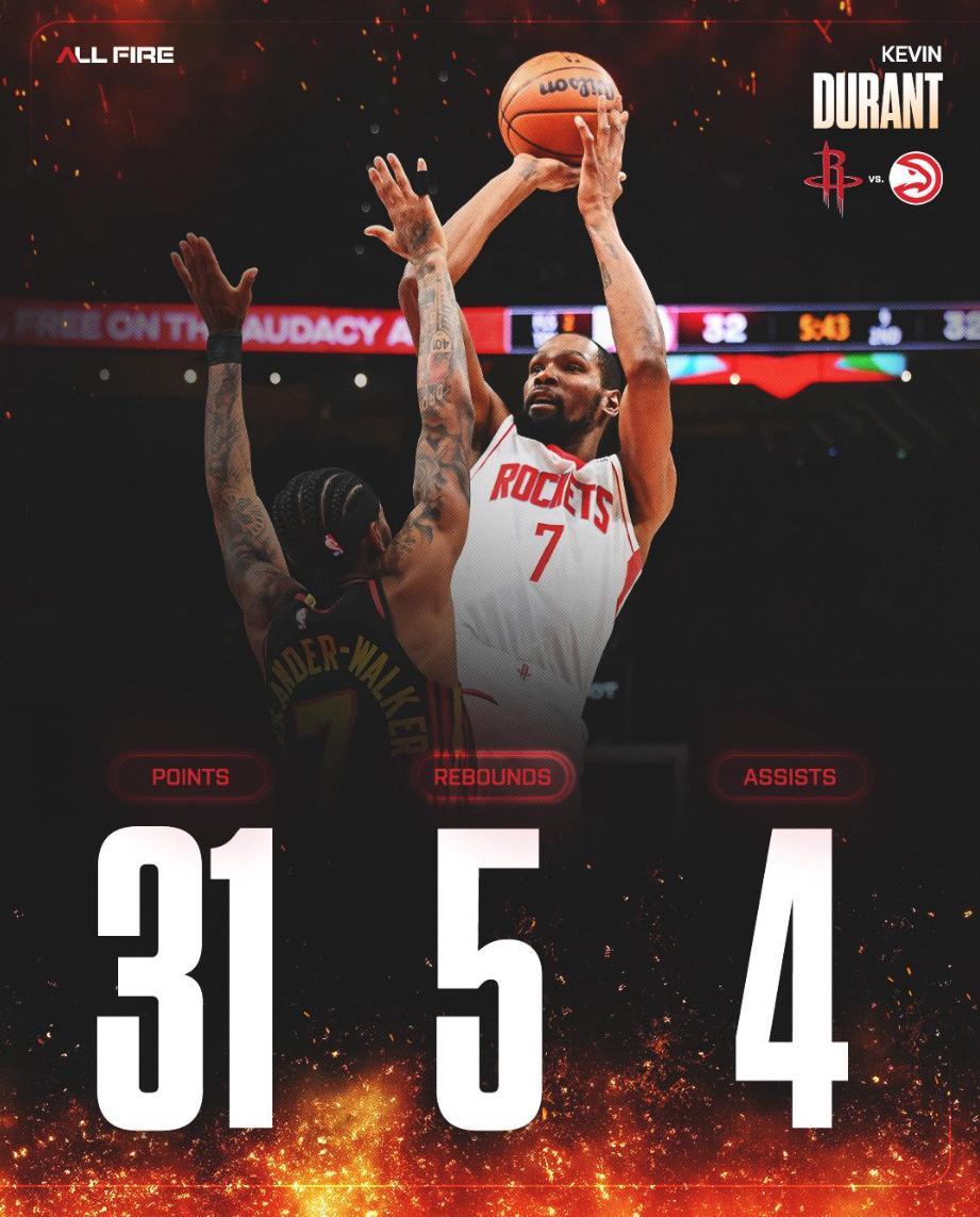 這場比賽伊森、芬尼-史密斯兩個鋒線因爲背靠背要輪休,杜蘭特需要承擔更多的登場任務,上半場KD拿到12分不溫不火,但第三節是他引來一波流,他單節打滿12分鐘,9中6,三分5中2,拿到16分3籃板1助攻,火箭一波35-24打崩老鷹。