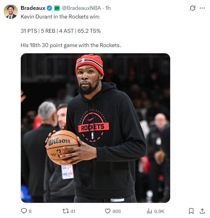 這場比賽杜蘭特也迎來了兩個里程碑,他拿到火箭生涯第十八場30+,也拿到職業生涯第245場30分+且真實命中率65%與庫裏並列歷史第二,僅次於詹姆斯283場。