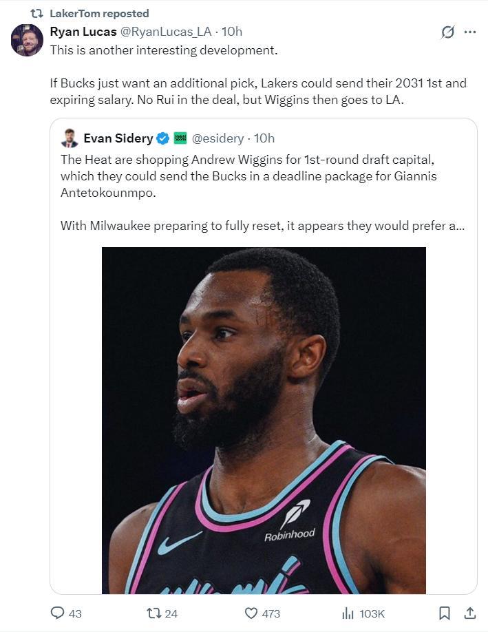 除此之外,根據《福布斯體育》記者埃文-斯迪瑞的報道,熱火隊正在兜售威金斯,他們爲了追求揚尼斯希望從嘴哥的交易中得到一個首輪籤爲回報,湖人可以送出他們2031年無保護的首輪籤,而且在交易中無需納入八寸壘,只要湖人願意送出首輪籤就可以得到威金斯。