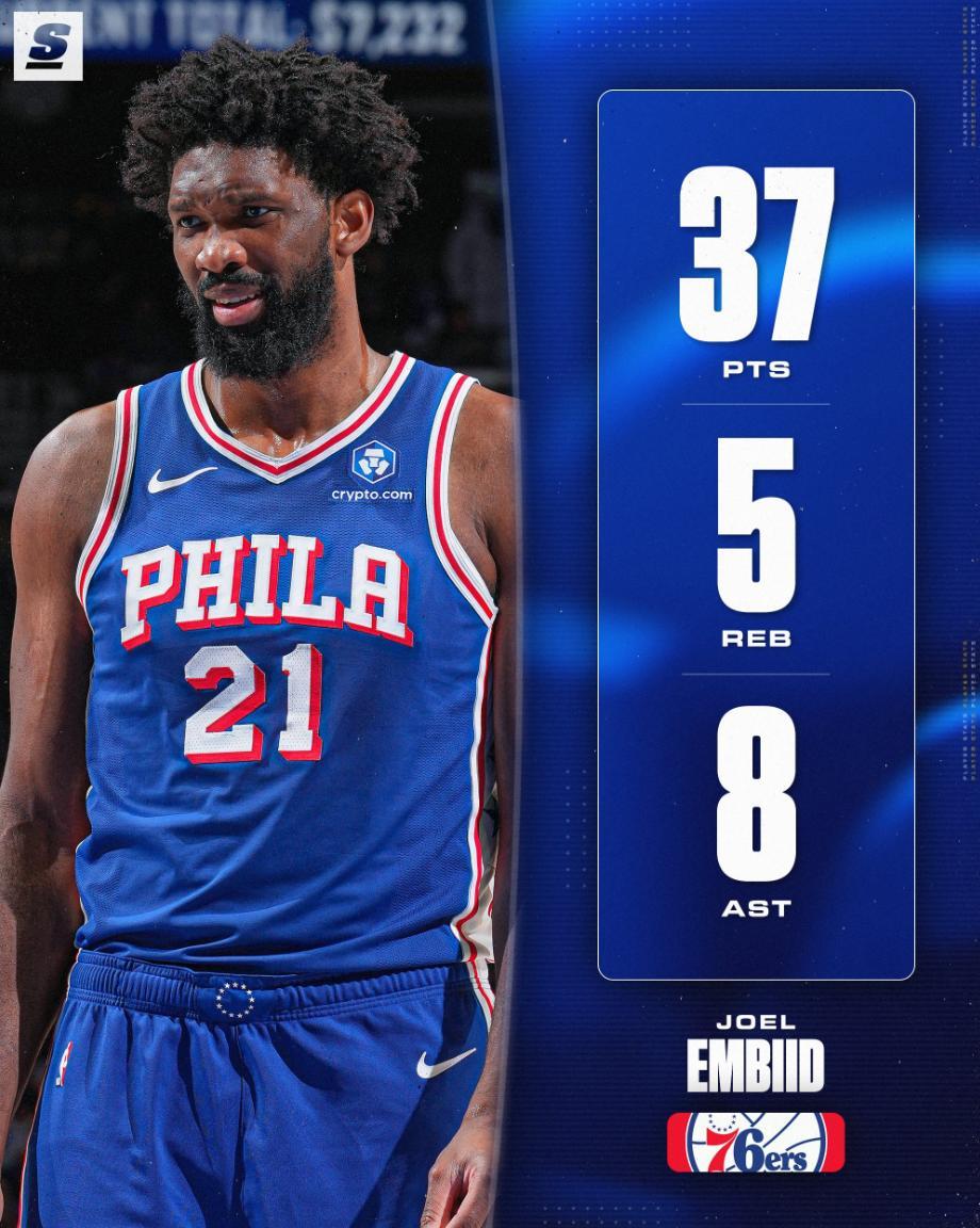 第二功臣當然是大帝,36分鐘,21中13,三分2中1,罰球13中10,拿到37分8助攻5籃板1搶斷1蓋帽,命中率61.9%,三分命中率50%,正負值+9。恩比德近期的個人狀態有明顯的提升,他真的夢迴巔峯了。