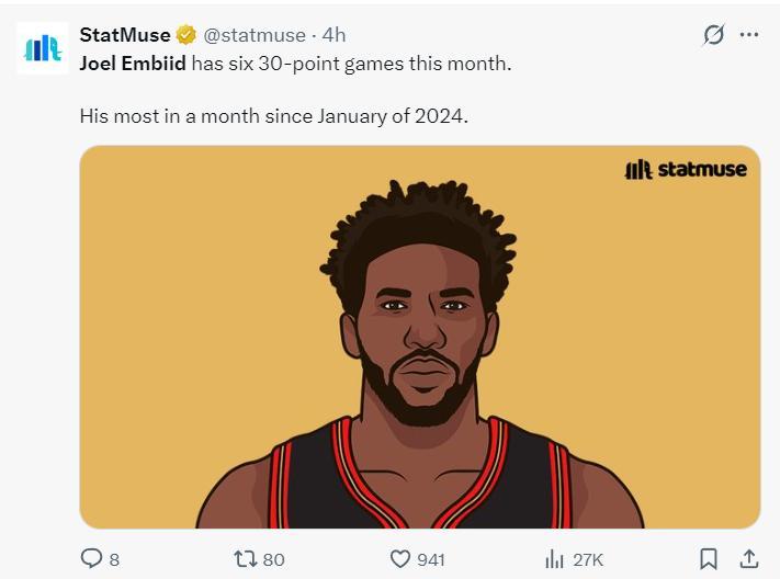 此役後大帝再度創造多項紀錄:1.本月恩比德已經拿到6次30+,這是他2024年1月後最多30+表現;