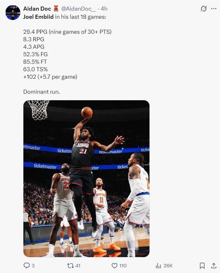 過去的6場比賽恩比德拿到了5次30+,場均35.6分鐘,拿到33.2分9籃板5.8助攻0.5搶斷0.7蓋帽,命中率54%,三分命中率50%,罰球命中率86.2%。