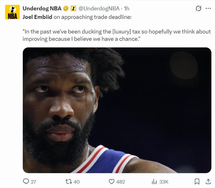 賽後恩比德接受採訪談到交易截止日,大帝說道:過去幾個賽季我們一直在避開奢侈稅,但這一次我希望球隊能有所改變,因爲我覺得補強後我們會有機會去衝擊我們最大的那個目標。