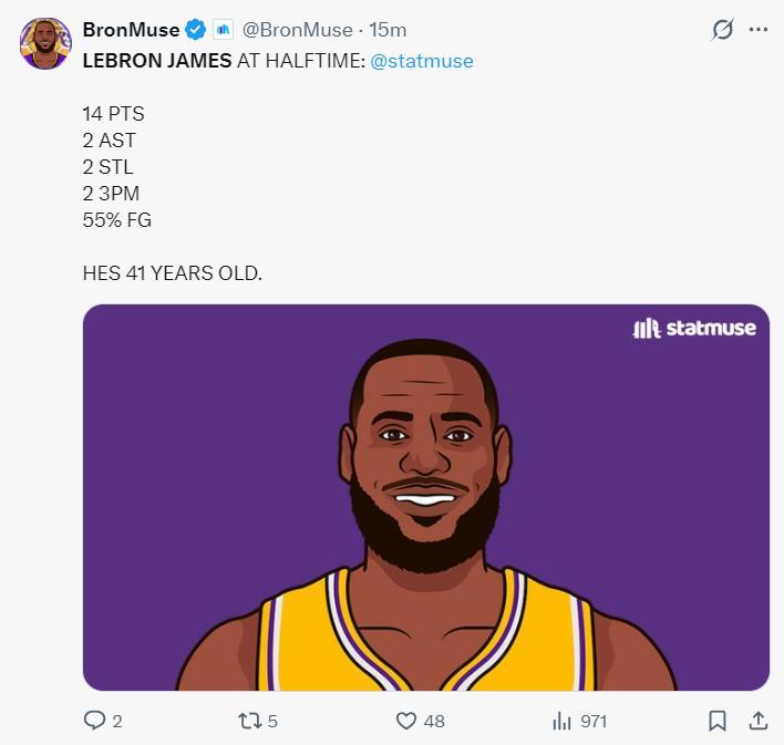 而且勒布朗上半場打了17分鐘,他以55%的命中率拿到14分1籃板2助攻2搶斷2個三分球,勒布朗打無球的效率也很高,41歲的老頭子再一次打臉外界的質疑。