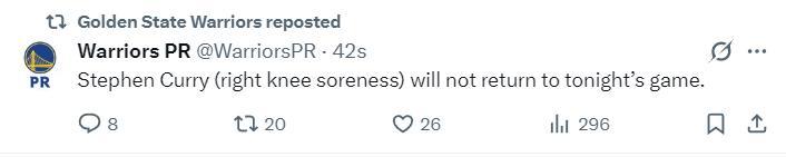 勇士官方:斯蒂芬-庫裏的右膝仍有疼痛症狀,他將缺席本場比賽的末節。