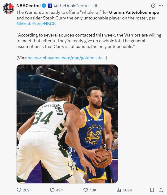 賽前根據NBC的報道,勇士會對揚尼斯進行豐厚的報價,勇士內部只有庫裏一人是非賣品。