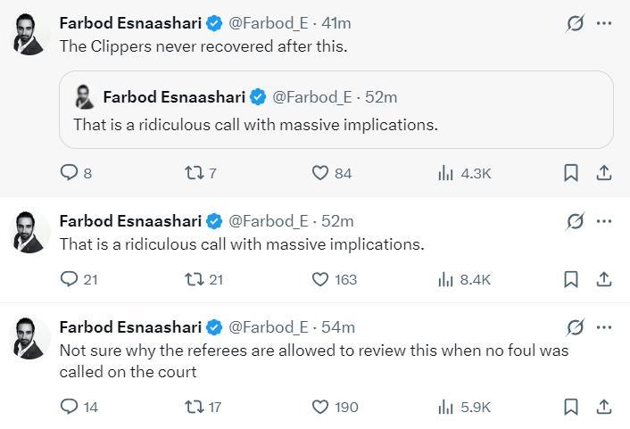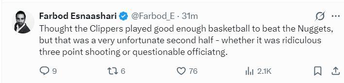 賽後船記Farbod Esnaashari繼續吐槽,儘管快船隊的整體表現還算不錯但還是沒能擊敗掘金,無論是球隊一波荒誕的三分出手還是裁判那令人窒息的吹罰尺度。