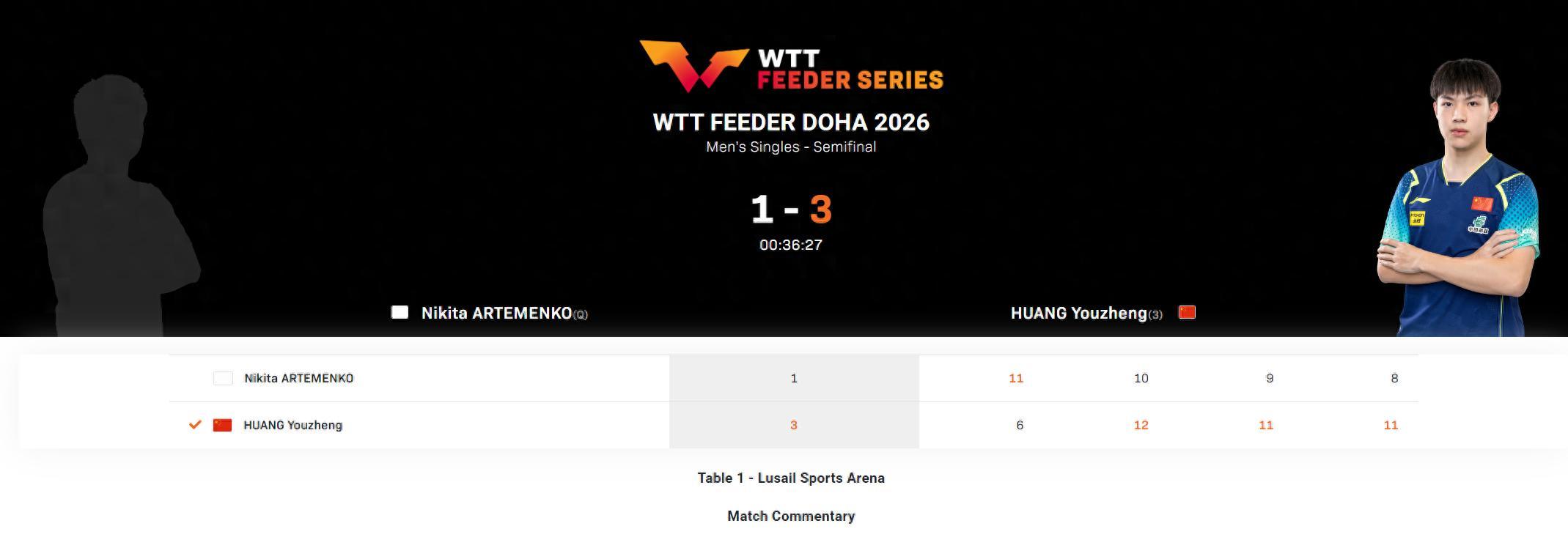 北京時間1月31日,WTT多哈支線賽男單半決賽,黃友政3-1擊敗尼基塔-阿爾喬緬科晉級決賽,四局比分:【6-11,12-10,11-9,11-8】。這是黃友政短短18小時連續兩項進入決賽,他此前與溫瑞博搭檔也拿到了男雙半決賽的勝利晉級決賽。